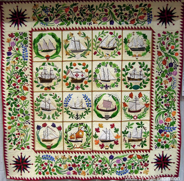 Shirley adds, "After appliqueing the blocks, I postponed quilting it until I felt competent enough in my free motion quilting skills to perform a good job. I felt my quilting skills progressed significantly while quilting it. I am pleased with the results." And, we'd like to add that we are amazed with the results, which are most stunning ! This is one of those quilts which will always be a treasured heirloom.