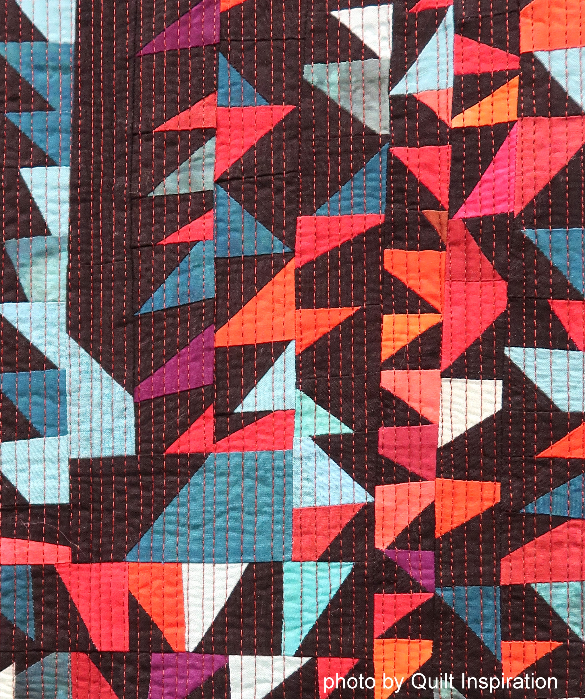 High Anxiety was machine quilted on a longarm using straight lines of orange-red thread which stand out nicely against both the dark and light pieces in the quilt.