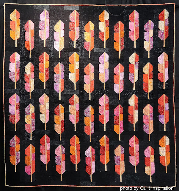 Are you incorporating orange and other autumn colors into your current projects? Here is a contemporary quilt that highlights glorious feathers in warm hues. Even better, this quilt is made from scraps! We love the repetitive motion of the straight, staggered feathers.