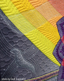 Elsie continues, "The machine quilting was done on a small domestic sewing machine ( Bernina 730), hand guided, with no aid of ruler or stitch regulator." Elsie's elegant quilting motifs are perfect for embellishing the white space on this multi-hued work.