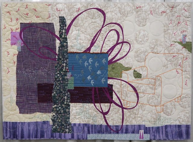 Here is a lovely art quilt collage made by Deborah Boschert with a variety of techniques: machine applique, hand embroidery, machine quilting without a frame, printmaking, and surface design. Notice the chair, stitched in red, in the open space at the right of the quilt. Deborah says: "For me, the chair symbolizes the importance of stillness. And making space. And the idea that clarity can come from rest."